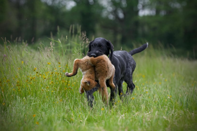 Van zodra 6 weken oud gaan we de pup alles voorschotelen, wat zijn buitdrift kan aanwakkeren. We gebruiken hiervoor alles wat de natuur ons ter beschikking stelt en een goede invloed KAN hebben op het instinct van onze leerling. Alle soorten wild of delen van wild kunnen hiervoor dienen.